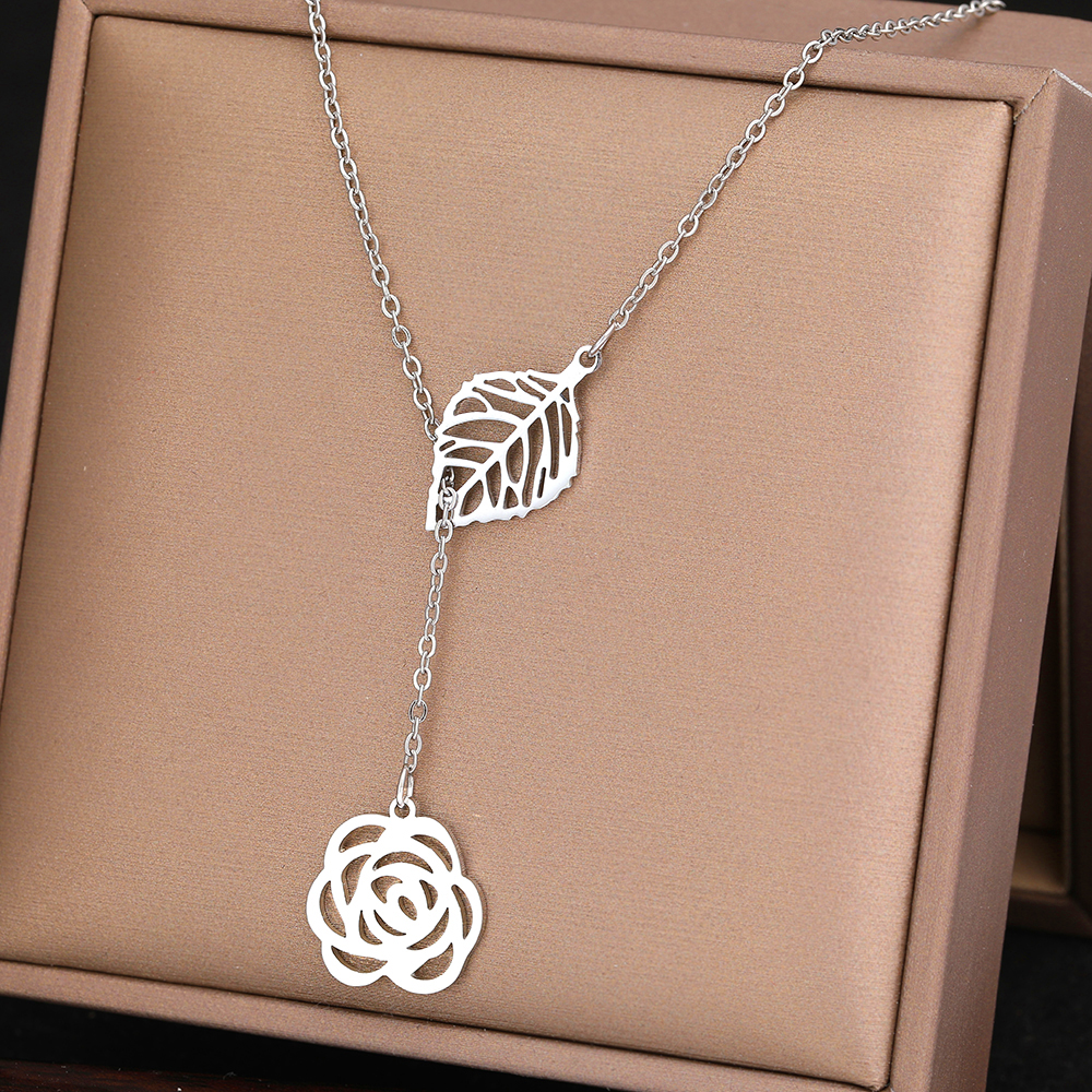 Stainless Steel Necklaces Vintage Delicate Temperament Leaves Rose Flower Pendant Charm Chains Choker Necklace For Women Jewelry Silver Color – Sumsfashion